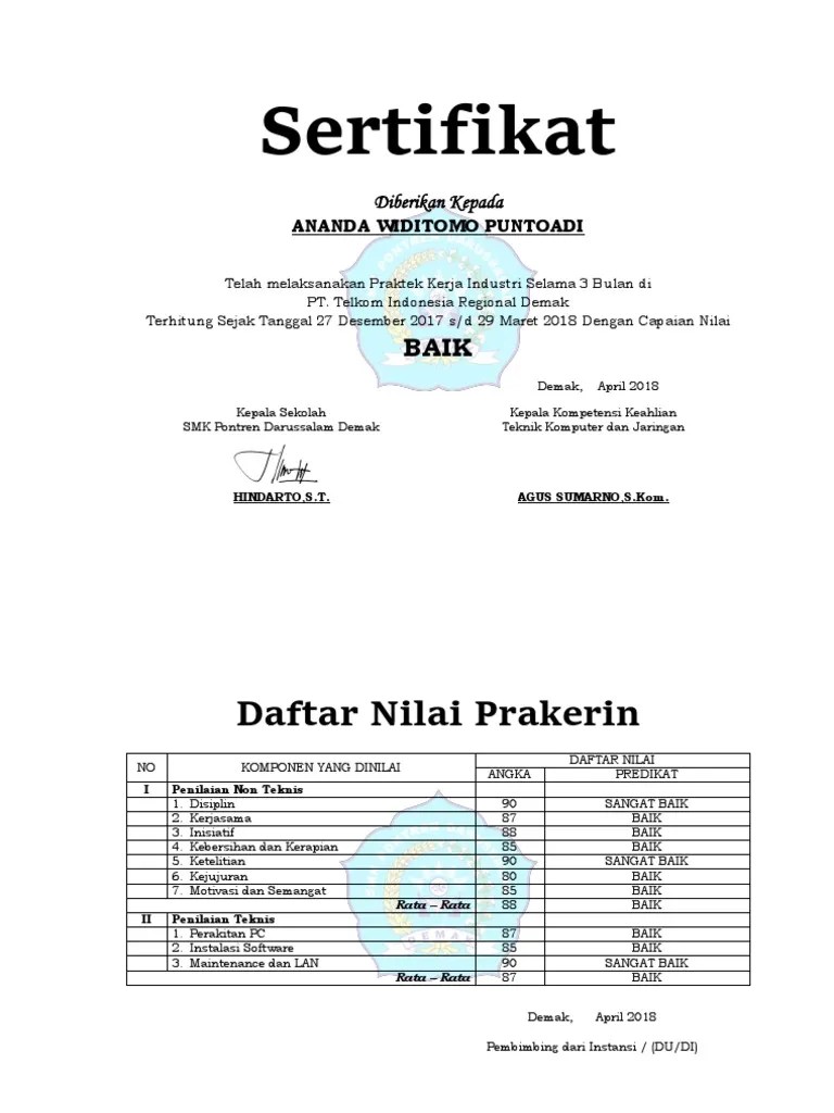 Sertifikat pkl ini telah dibuat . Web pendidikan di smkn 1 panyingkiran yang mendeskripsikan tentang profil sekolah, kompetensi keahlian, video tutorial, hasil karya, dan kegiatan siswa. Silakan dipilih dari versi yang tersedia, mengikuti . 3232021 contoh sertifikat prakerin pkl smk prakerin praktek kerja industri adalah kegiatan pendidikan pelatihan dan pembelajaran yang . Contoh sertifikat prakerin pkl smk prakerin praktek kerja industri adalah kegiatan pendidikan, pelatihan dan pembelajaran yang dilaksanakan didunia usaha atau . Di bawah ini disediakan sebuah contoh sertifikat untuk mahasiswa/i yang telah melaksanakan pkl di sekolah. Maka setelah ada formatnya saya . Desain sertifikat pkl smk doc, desain sertifikat pkl di koperasi, contoh desain sertifikat, download desain sertifikat word, . Sertifikat sekaligus formulir penilaian magang jadi satu bentuk seperti gambar di bawah. Kepala sekolah smk permata dunia menyatakan : Lahir pada tanggal 10 januari 1993 di sihite, siswa smk swasta sm.raja xii. Contoh sertifikat prakerin multimedia 1.