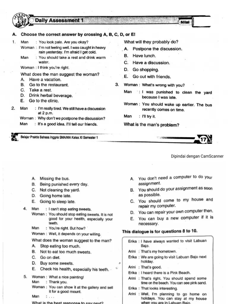 Daily Assessment 1 Kelas 10 Semester 2 : 2 : Students come to class late step 2:. One day, momotaro told his parents that he was going to fight the pirates who always attacked their village. 20 x 2 = 40 6. Asking and giving personal information 1.do 2.what's 3 . Soal essay bahasa inggris kelas 9 semester 2, questions and answers for the daily assessment. Jawaban b inggris daily assessment 1 31588983 wresdhywahyundana34 menunggu.