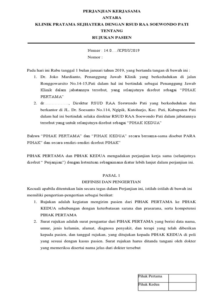 Contoh Mou Rujukan Antar Rumah Sakit Pdf / Contoh Surat Kuasa Horizontal Dan Vertikal - ashlynnnews : Dalam perjanjian kerjasama ini yang dimaksud dengan :. Pemberi pelayanan kesehatan rujukan adalah rumah sakit. Rumah sakit tni angkatan laut dr. Rumah sakit umum daerah (rsud) dr. Perjanjian kerjasama, bpjs kesehatan, rumah sakit . (1) kesepakatan bersama ini akan ditindaklanjuti dengan perjanjian kerjasama antara.
